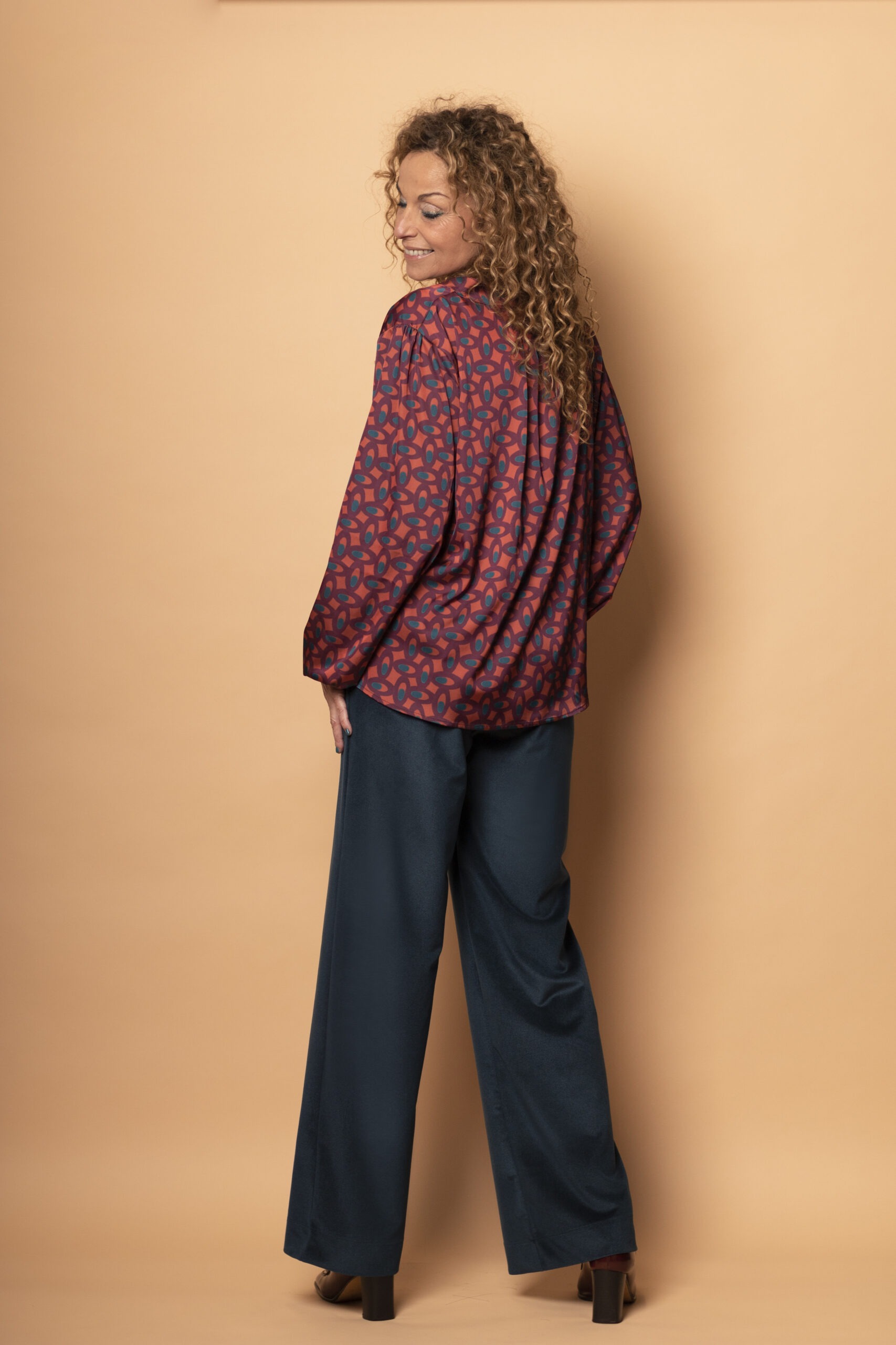 • Estil: brusa versàtil i molt còmoda, ideal per al dia a dia o moments especials. El seu disseny sense botons i el puny elàstic la converteixen en una peça fàcil de portar, es-tilosa i funcional, perfecta per portar sola o com a part d’un conjunt amb els pantalons o la faldilla del mateix estampat.