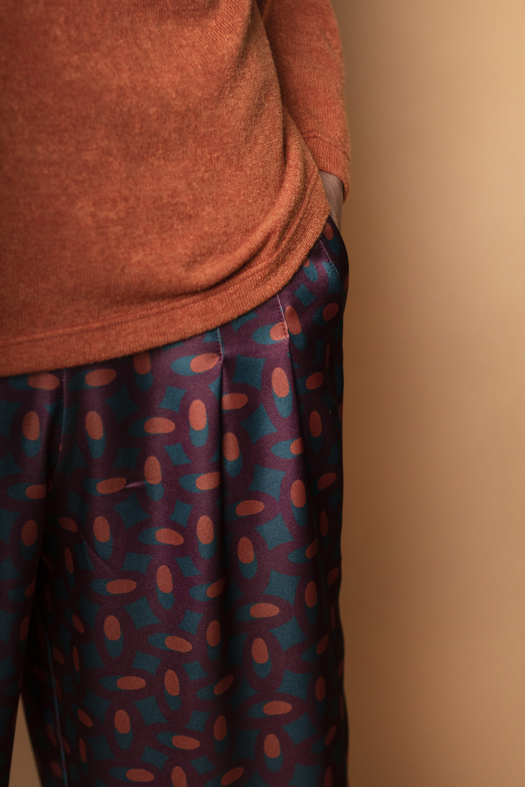Pantalons loose, ampli i fluid, dissenyat per oferir comoditat sense renunciar a l’estil. Confeccionat en un teixit sedós lleugerament elàstic, amb estampat geomètric exclusiu, de tacte ultra suau i amb un lleuger acabat setinat que aporta sofisticació.