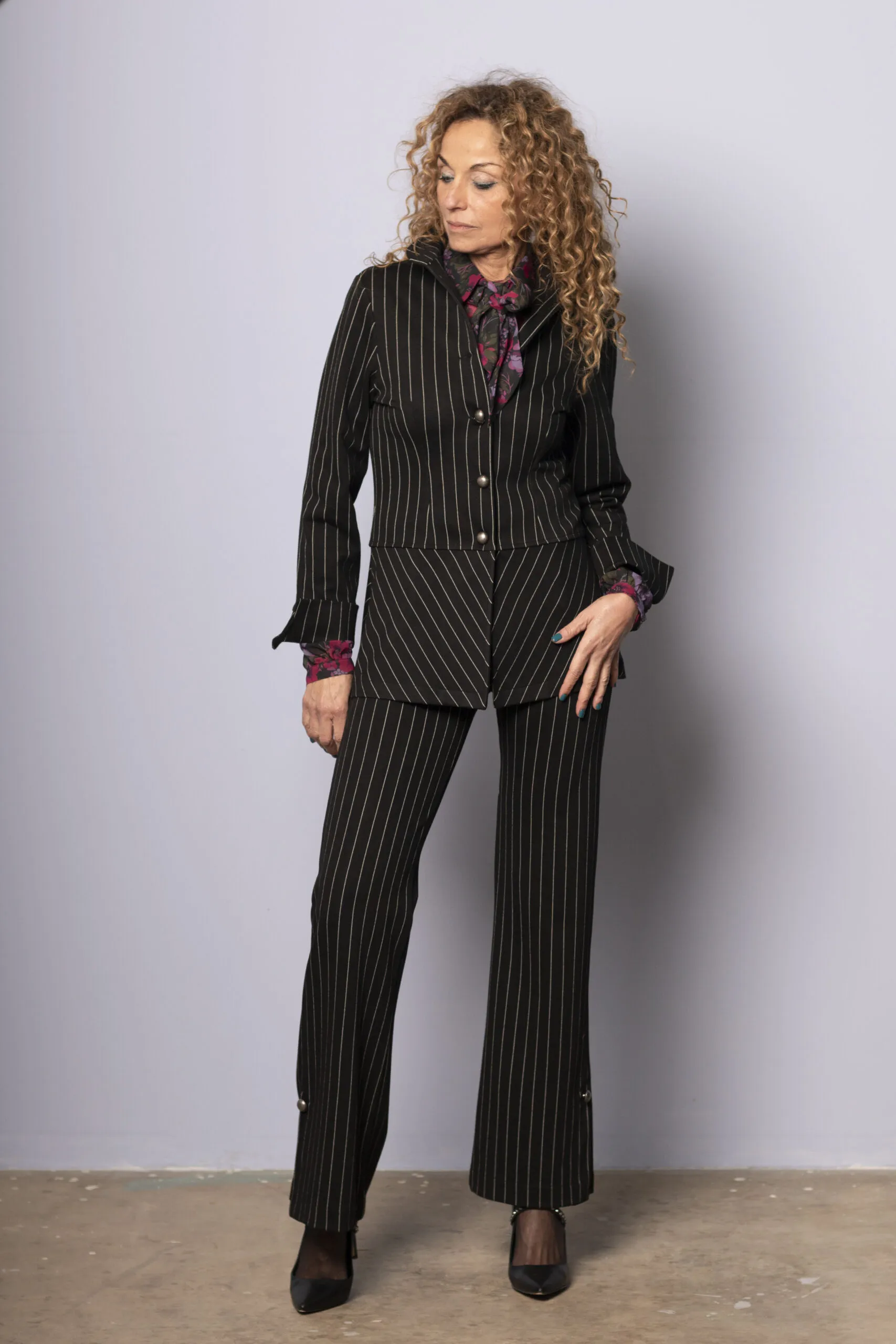 Blazer de ratlla diplomàtica entallada amb coll Mao. Sofisticada i moderna dissenyada per a dones que valoren l’elegància amb caràcter. Estil clàssic amb un gir avantguardista.