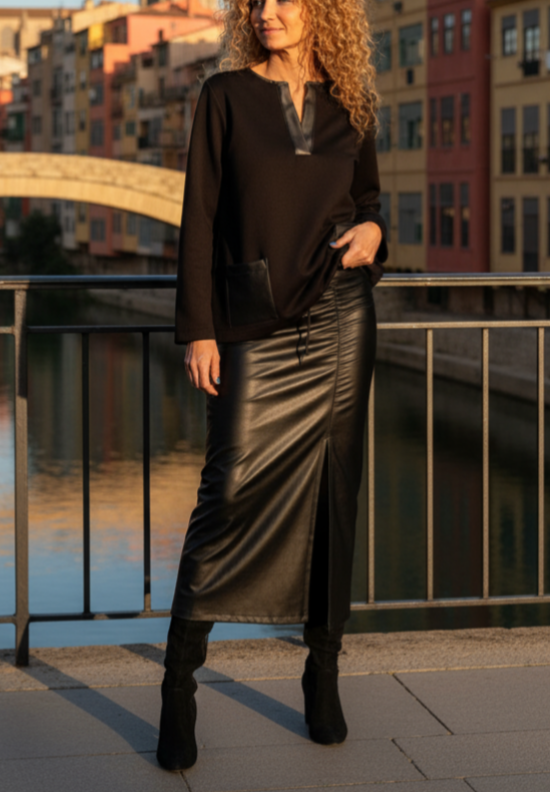 Faldilla negra llarga Drapejada en Polipiel Elàstica amb obertura. Atrevida, elegant i amb molt de caràcter. Una falda que combina el poder del disseny amb la comoditat del teixit.