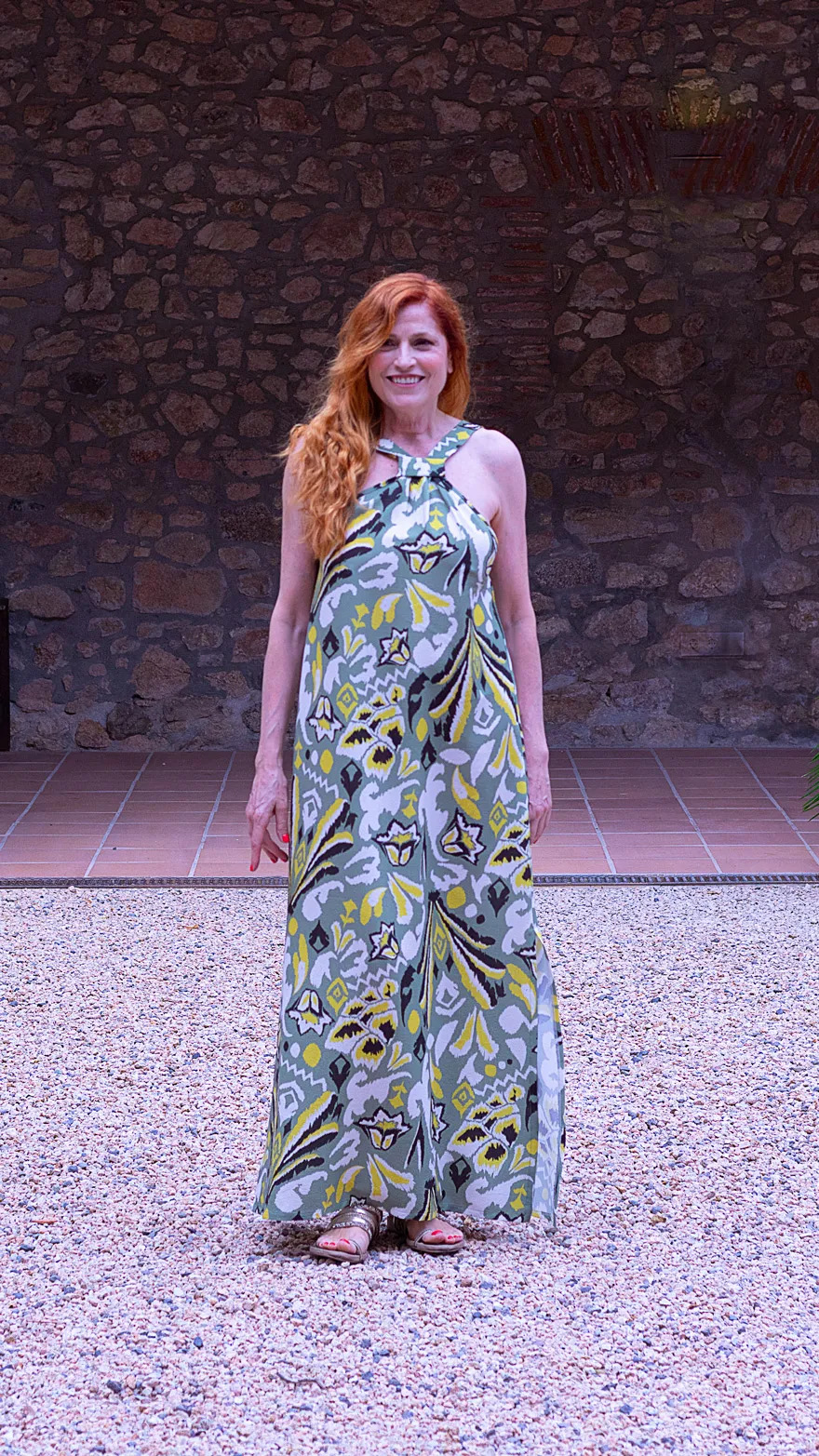 Este vestido largo recto que define sutilmente la figura sin ajustarse, ofreciendo una caída fluida que favorece distintos tipos de cuerpo. El diseño del cuello, inspirado en el favorecedor cuello Halter, incorpora un nudo central del que nacen dos tirantes anchos y se proyectan hacia la espalda, creando un escote atractivo y estructurado que aporta personalidad y sofisticación. Los cortes laterales en la parte inferior del vestido no solo añaden movimiento y ligereza, sino que también brindan mayor amplitud y comodidad al andar, haciendo de esta prenda una opción ideal tanto para ocasiones especiales como para estilismos más relajados con un toque refinado.