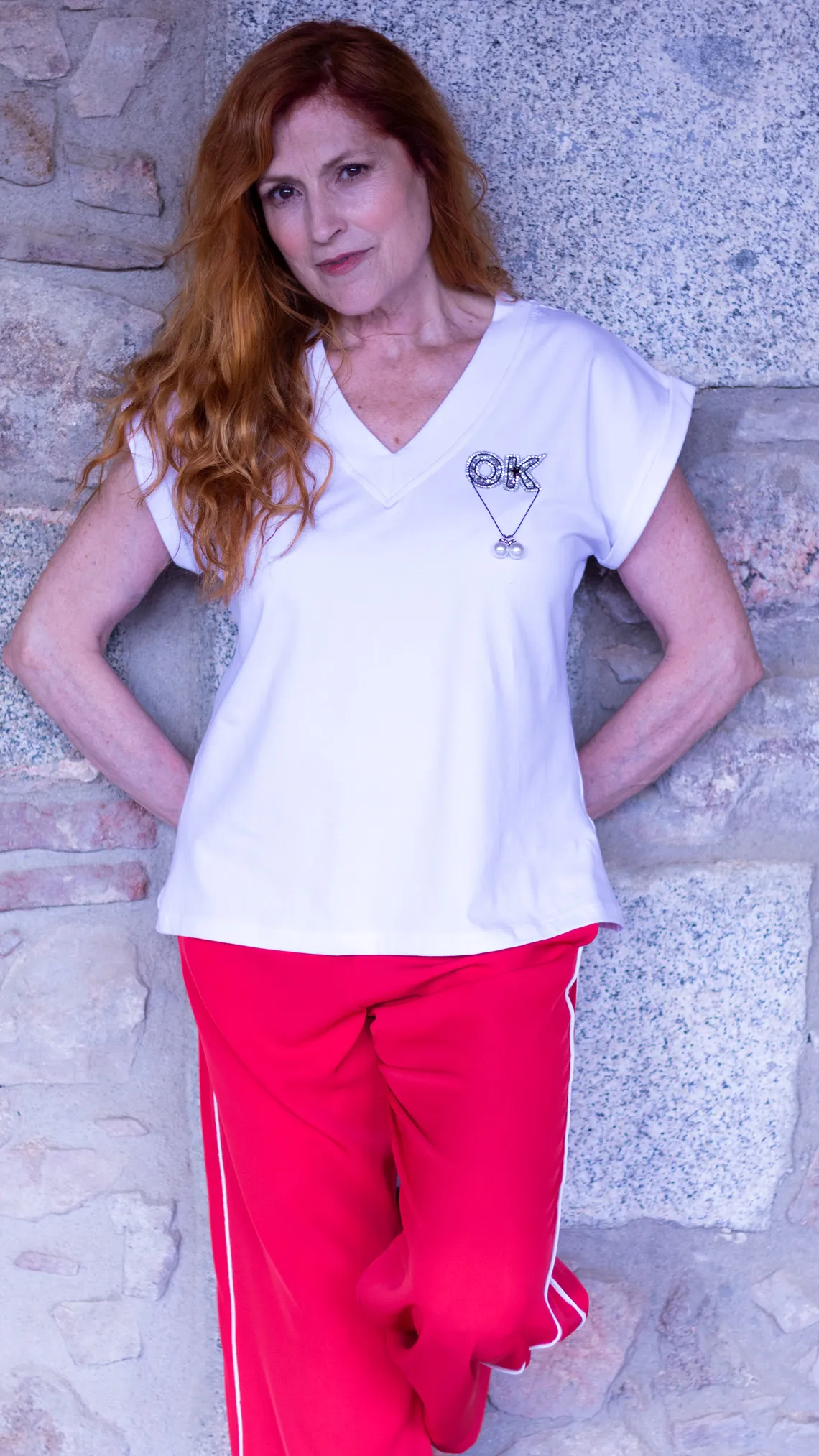 La T-shirt “OK” destaca por su comodidad, frescura y personalidad, perfecta para quienes buscan un básico con un toque especial. Su diseño incorpora manga corta caída con vuelta, un corte fluido que no marca y un escote en pico que favorece el escote y estiliza la silueta. Está confeccionada en tejido de piqué, con composición mayoritaria de viscosa de origen natural combinada con poliamida, lo que garantiza una prenda suave, transpirable y fácil de mantener, ideal para el uso diario. El detalle más llamativo es su transfer decorativo con la palabra “OK” en tonos plata, acompañado de una pequeña cadena metálica y perlas colgantes, que aportan un aire moderno y femenino. Una t-shirt versátil, con carácter y estilo propio, ideal para elevar tus looks más casuals.