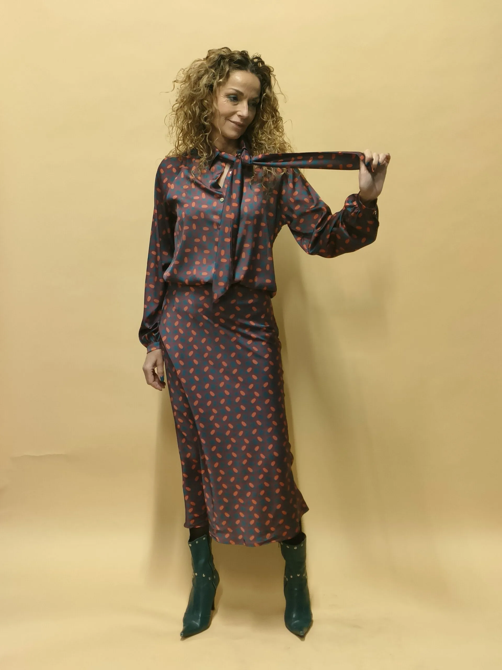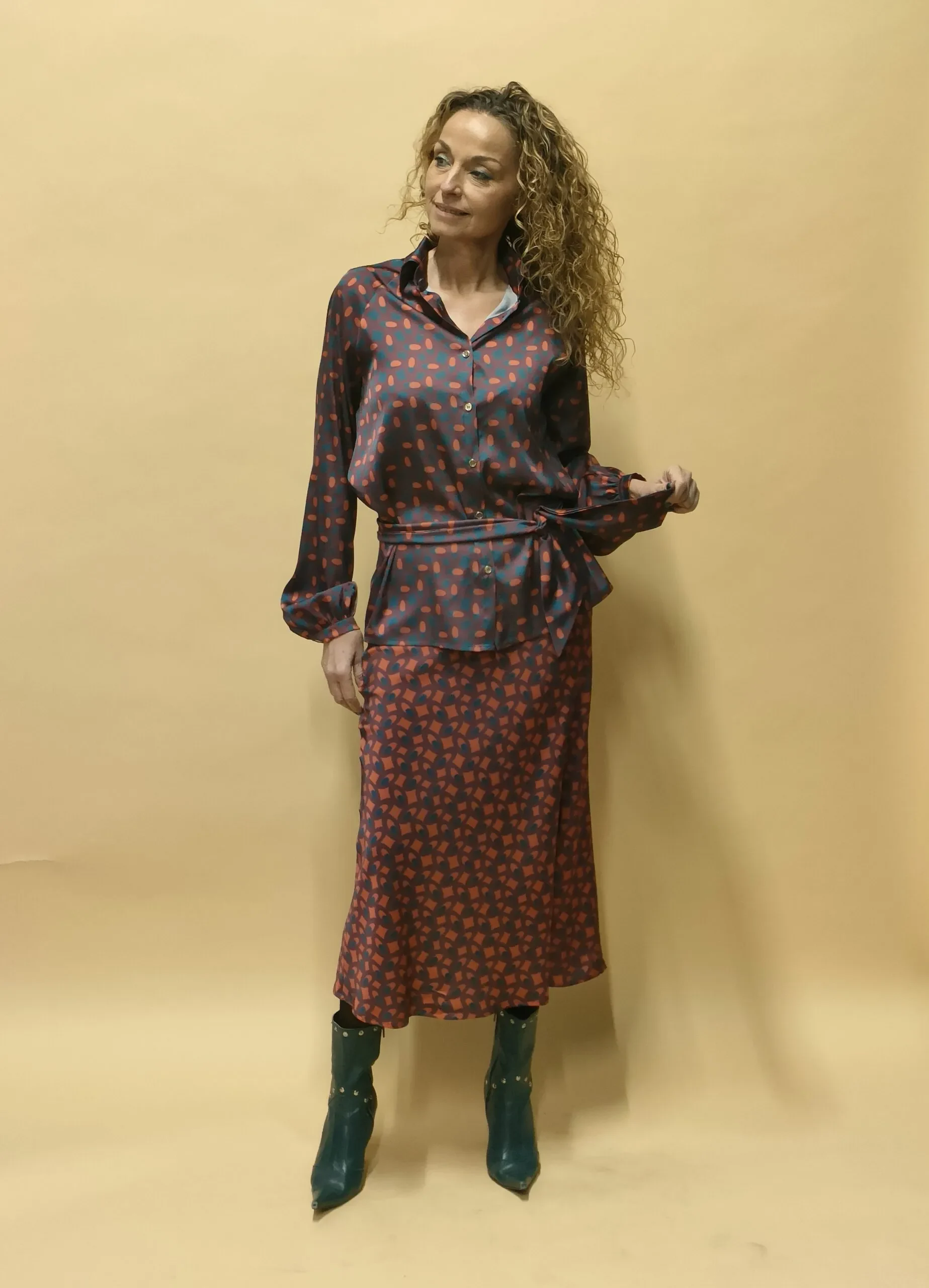 Falda larga con corte al bies que realza la caída natural del tejido, aportando movimiento fluido y elegante. Confeccionada en un tejido sedoso ligeramente elástico con estampado geométrico exclusivo, de tacto ultra suave y con un sutil acabado satinado, esta prenda combina comodidad y sofisticación.