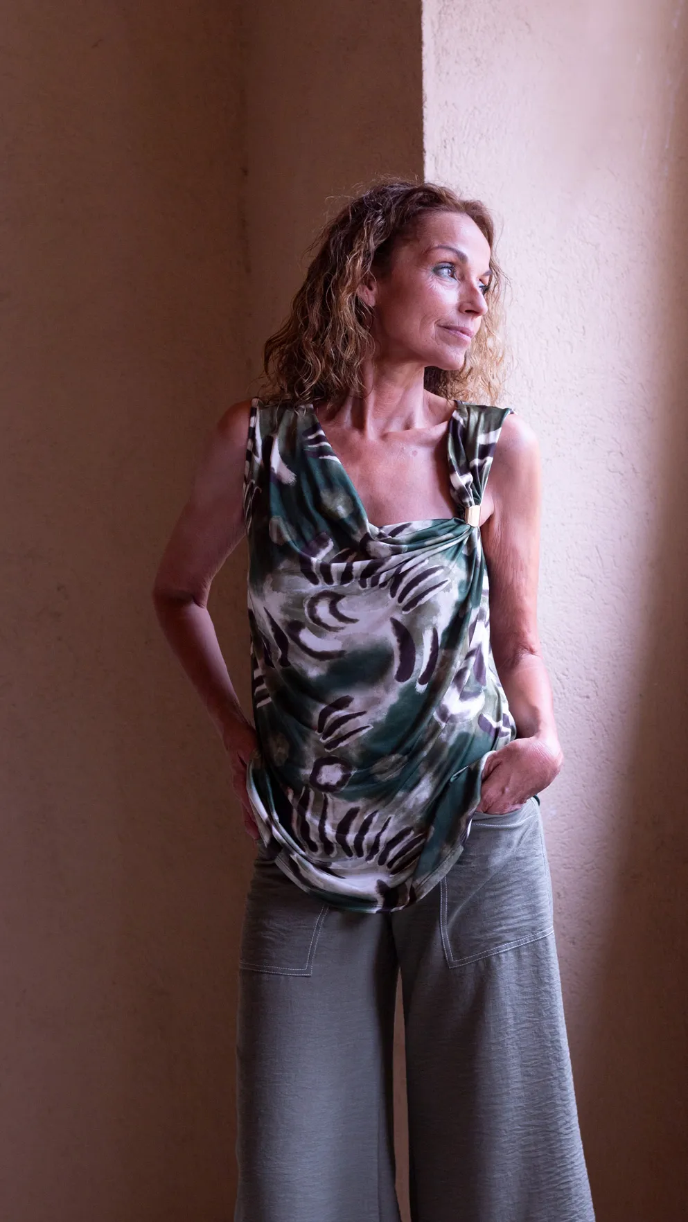 Top diseñado con un toque fresco y elegante. Es un top fluido, amplio y muy cómodo, ideal para lucir con estilo sin sacrificar la comodidad. Tiene tirantes anchos con un aspecto sofisticado. El escote delantero es drapeado y asimétrico, creando un efecto visual muy elegante y moderno. Además, en uno de los tirantes incorpora una pequeña pieza dorada que añade un toque de brillo y detalle distintivo. La espalda es cubriente, proporcionando una sensación de cobertura y confort. En conjunto, es un top versátil, chic y cómodo, perfecto para combinar con diferentes prendas y ocasiones.