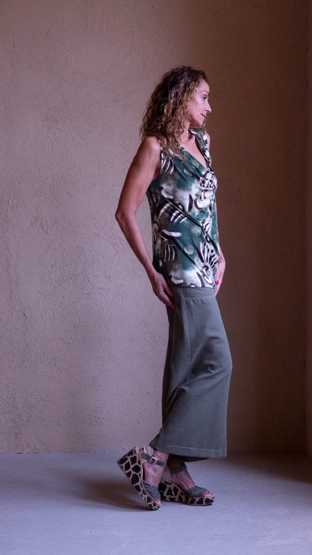 Colección inspirada en los paisajes y colores de los pueblos de la Toscana, una región que evoca belleza, historia y naturaleza. Esta colección captura la esencia de la Toscana a través de tonos cálidos y terrosos que reflejan sus paisajes: beige arena ,mokas ,ocres dorados y verdes kahis. Los colores del estampado se combinan en prendas que transmiten la calidez del sol mediterráneo y la serenidad de sus colinas, pueblos y viñedos. Tejido de alta gama que combina elegancia ,comodidad y practicidad. Este tejido está elaborado con poliéster de alta calidad (PES) y elastano- Tejido de seda fría, lo que le confiere una sensación increíblemente fresca y suave al tacto. Es un material muy cómodo, perfecto para quienes buscan elegancia sin sacrificar la sensación de bienestar. Su caída es excepcional, fluida y ligera, permitiendo que las prendas hechas con este tejido se muevan con gracia y naturalidad, resaltando la silueta de manera sutil y sofisticada. Además, es un tejido que no se arruga , lo que facilita su mantenimiento y lo hace ideal para uso diario o eventos especiales sin preocuparse por planchar constantemente.