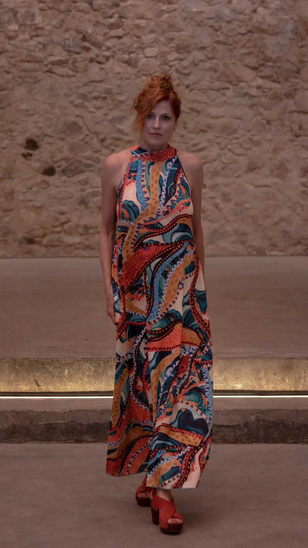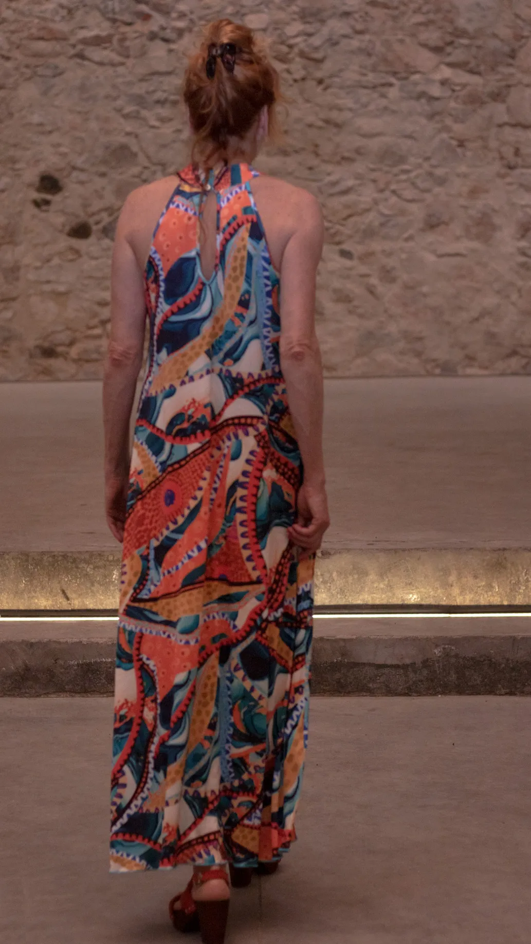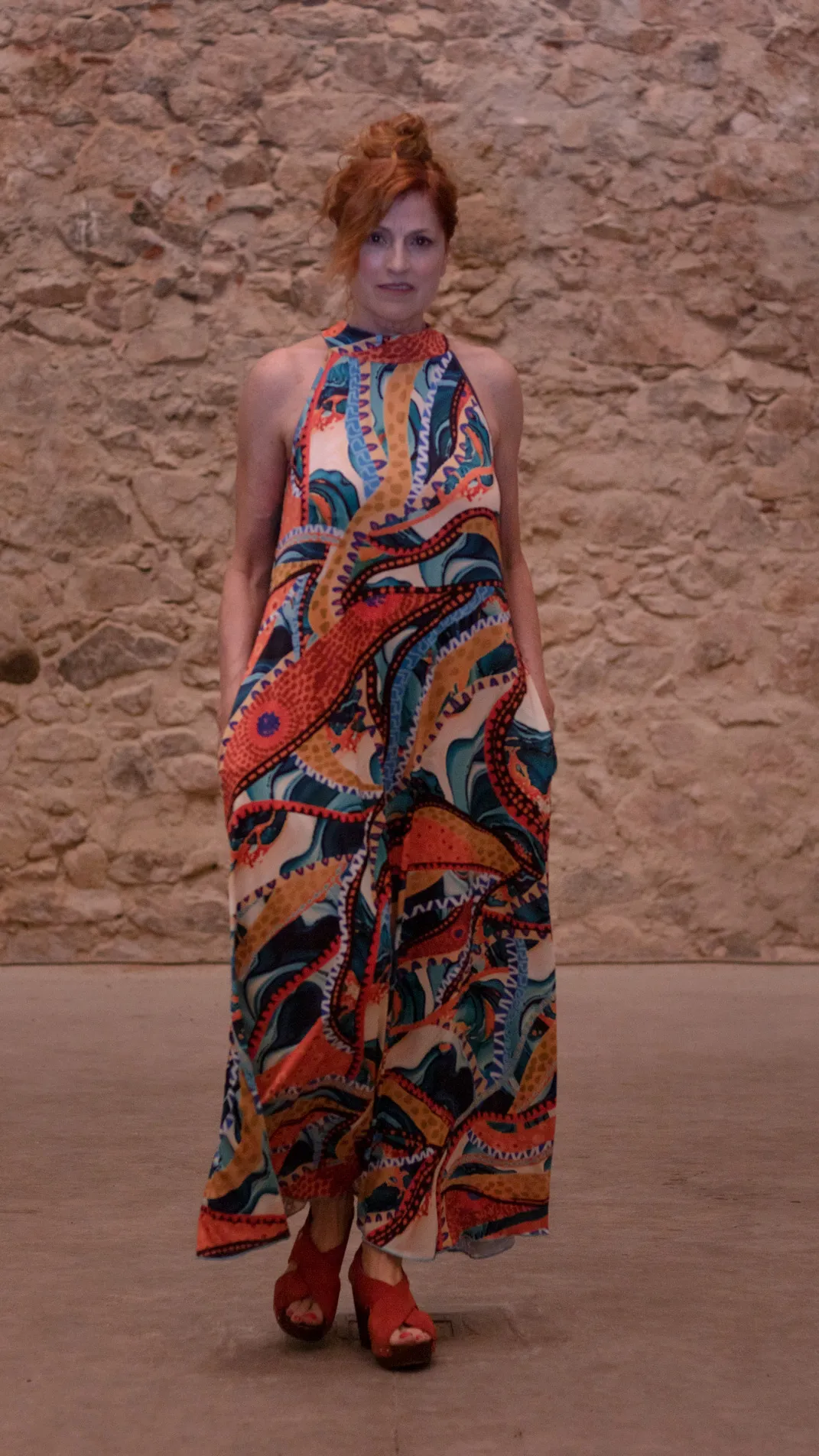Vestido con estampado Marrakech que transmite un aire colorido y lleno de vida al mismo tiempo chic. Tiene un diseño de cuello Halter que resalta los hombros y el cuello, dándole un toque sofisticado y moderno. En la parte trasera del cuello, lleva una botonadura que añade un detalle delicado y funcional, permitiendo ajustar o simplemente decorar la apertura. El vestido es suelto y fluido, lo que lo hace muy cómodo para usar en cualquier ocasión, permitiendo libertad de movimiento y una sensación ligera en la piel, se adapta a cualquier figura . Además, incorpora bolsillos en los laterales que aportan funcionalidad sin perder estilo. Está confeccionado en un tejido de seda fría, que tiene una caída suave y natural, además de un acabado ligeramente satinado que le da un brillo sutil y elegante. En conjunto, es una prenda perfecta para lucir cómoda, chic y con un toque de sofisticación en cualquier momento del día.
