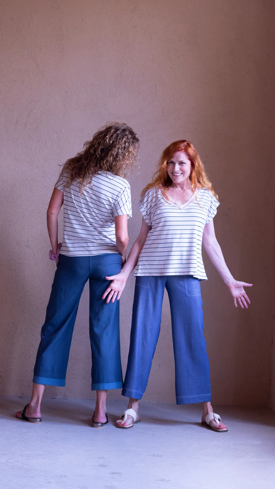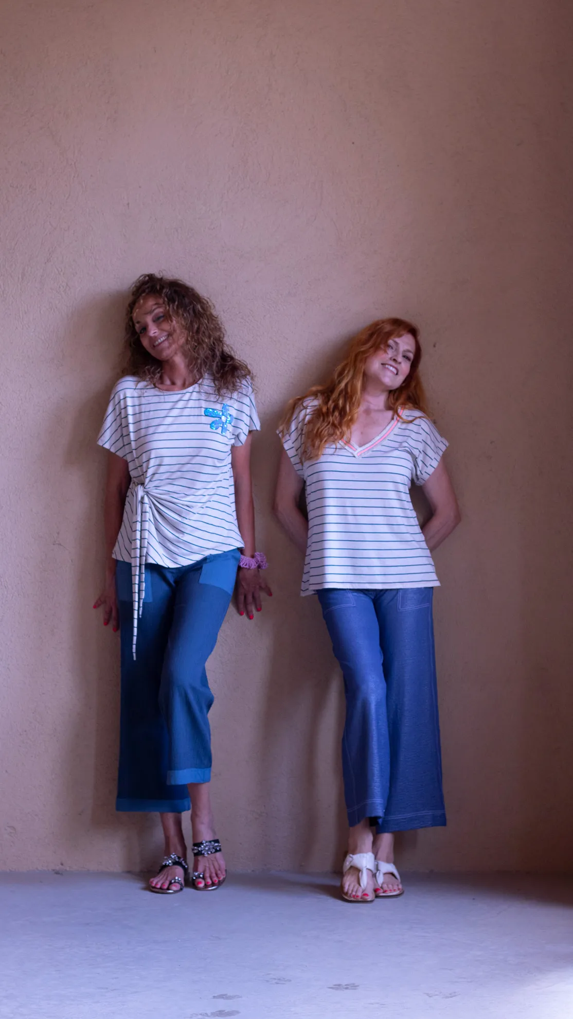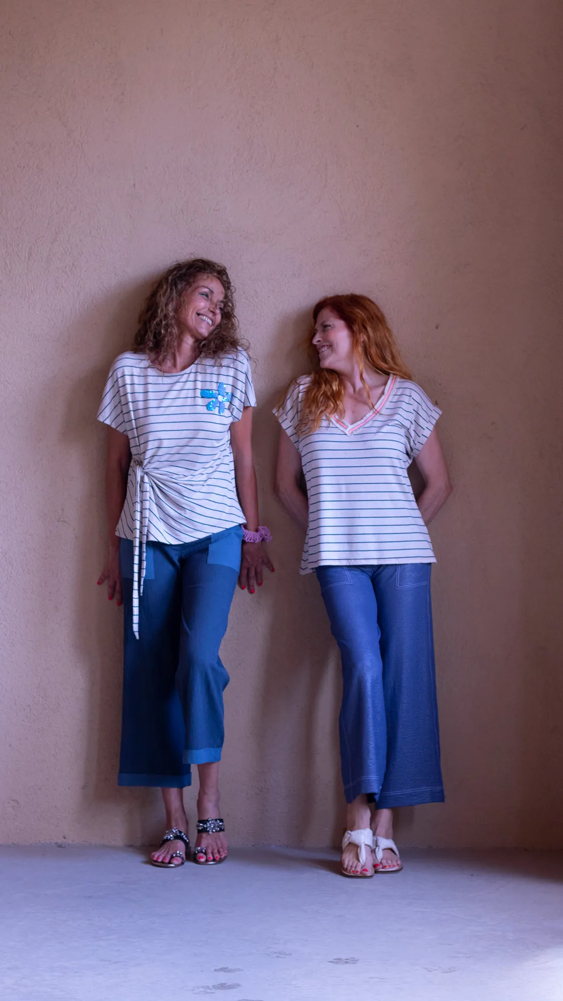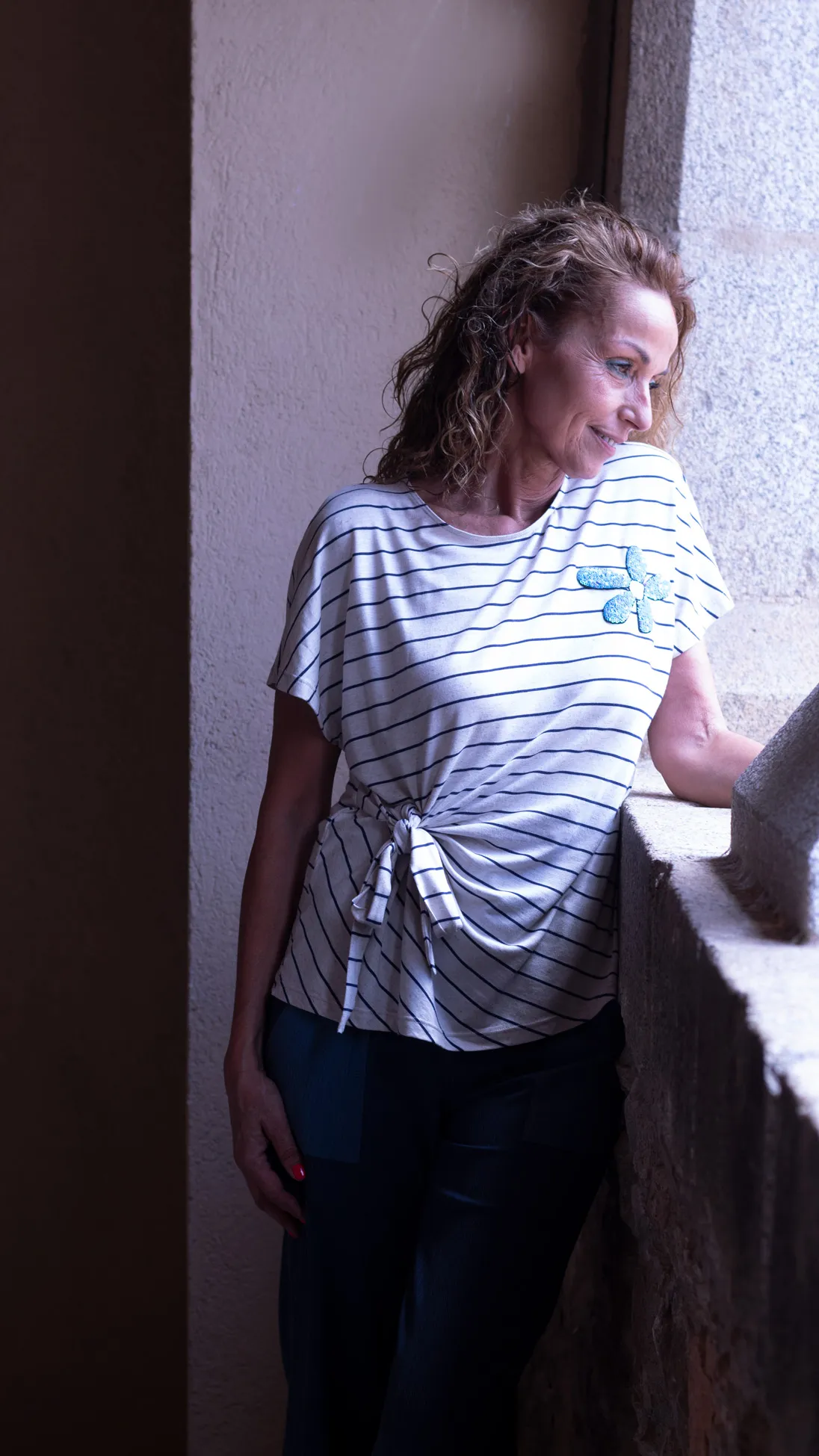 Top diseñado para ofrecer comodidad, estilo y una silueta favorecedora en una sola prenda. Con un corte fluido y manga corta, incorpora un nudo lateral estratégicamente colocado que ayuda a disimular la zona abdominal, estilizando visualmente la figura sin renunciar al confort. Confeccionado en un tejido de rayas en tonos ivory y azul, su composición mezcla fibras naturales como la viscosa , poliéster reciclado y elastano para aportar ligereza, frescura y elasticidad suave, ideal para climas cálidos y uso prolongado. El diseño se realza con un delicado transfer de flor en color turquesa, que añade un toque especial, fresco y femenino al conjunto, sin perder su aire casual y versátil. Perfecto para combinar con jeans o pantalones fluidos, este top es una prenda atemporal y práctica, con ese extra de estilo que lo hace único.