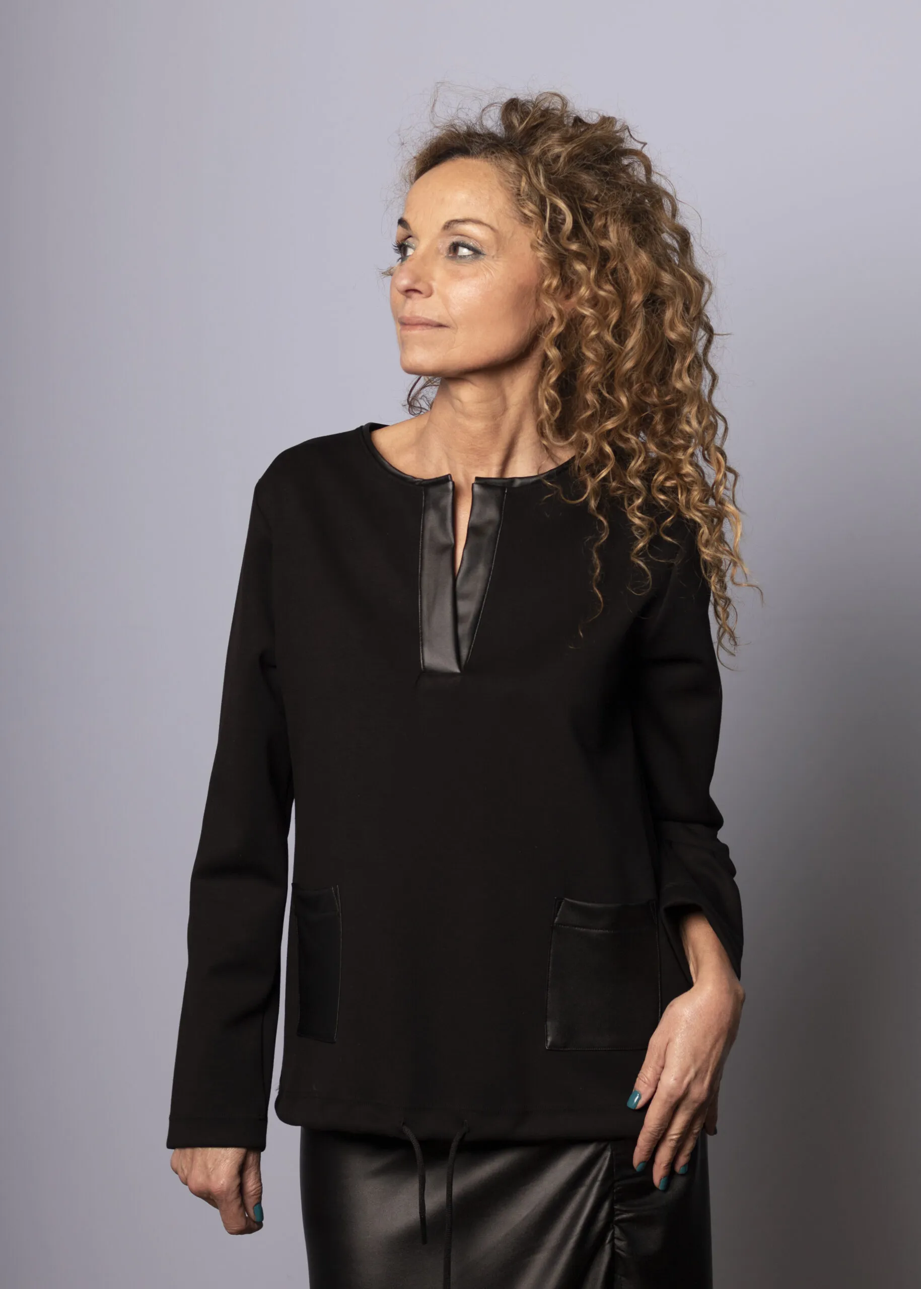 Jersey tipo sudadera en tejido técnico con detalles en polipiel. Comodidad casual con un giro sofisticado. Este Hoodie redefine el estilo urbano con una silueta contemporánea y detalles elegantes.